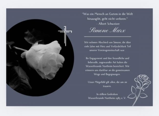 Mit großer Betroffenheit haben wir vom Tod unserer Vereinskameradin Simone Marx erfahren.Viele Jahre war Simone Teil der Wasserfreunde Northeim und brachte sich mit großem Engagement und Herzblut in unseren Verein ein.Ihr freundliches Wesen, ihre Hilfsbereitschaft und ihr Humor werden uns unvergessen bleiben. Wir erinnern uns dankbar an die gemeinsamen Momente am Beckenrand, bei Vereinsveranstaltungen, ihrem…